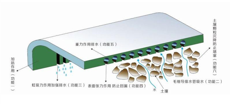 本產(chǎn)品采用PVC高密度聚合材料,具有較好的韌性,埋于土中可以起到拉結(jié)土壤的作用(功能一);且一反傳統(tǒng)改采用密集溝槽,內(nèi)大外小的設(shè)計(jì),且埋設(shè)時(shí)溝槽面向下,而使水流由下往上倒吸進(jìn)入毛細(xì)導(dǎo)水管(功能二);如此一來土壤顆粒因重力自然沉淀不致隨同水流進(jìn)入毛細(xì)導(dǎo)水管內(nèi),同時(shí)也不會(huì)在進(jìn)水槽溝附近產(chǎn)生淤積現(xiàn)象(功能三);但是內(nèi)部溝槽既能進(jìn)水,同時(shí)也造成漏水之后果,此時(shí)毛細(xì)防排水板則利用表面張力使水在溝槽上產(chǎn)生封閉效果不回漏(功能四);當(dāng)水進(jìn)入時(shí),毛細(xì)現(xiàn)象會(huì)自然而然對(duì)土壤中的水分產(chǎn)生抽吸的效果,直到灌滿并以重力流向外排放(功能五);當(dāng)水流到達(dá)出口將因落差產(chǎn)生虹吸作用,進(jìn)一步對(duì)土壤內(nèi)部產(chǎn)生負(fù)壓,大幅增加吸排水效果(功能六)。
